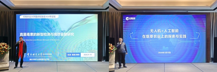 1989级微生物专业校友乐涛、2003级烟草种植专业校友郭保银、分别以《真菌毒素的新型检测与高效去除研究》《无人机+人工智能在烟草农业上的探索与实践》为题作专题分享,聚焦农业科技转化、区域产业协作等话题,传承母校“科教兴农为己任”的初心。